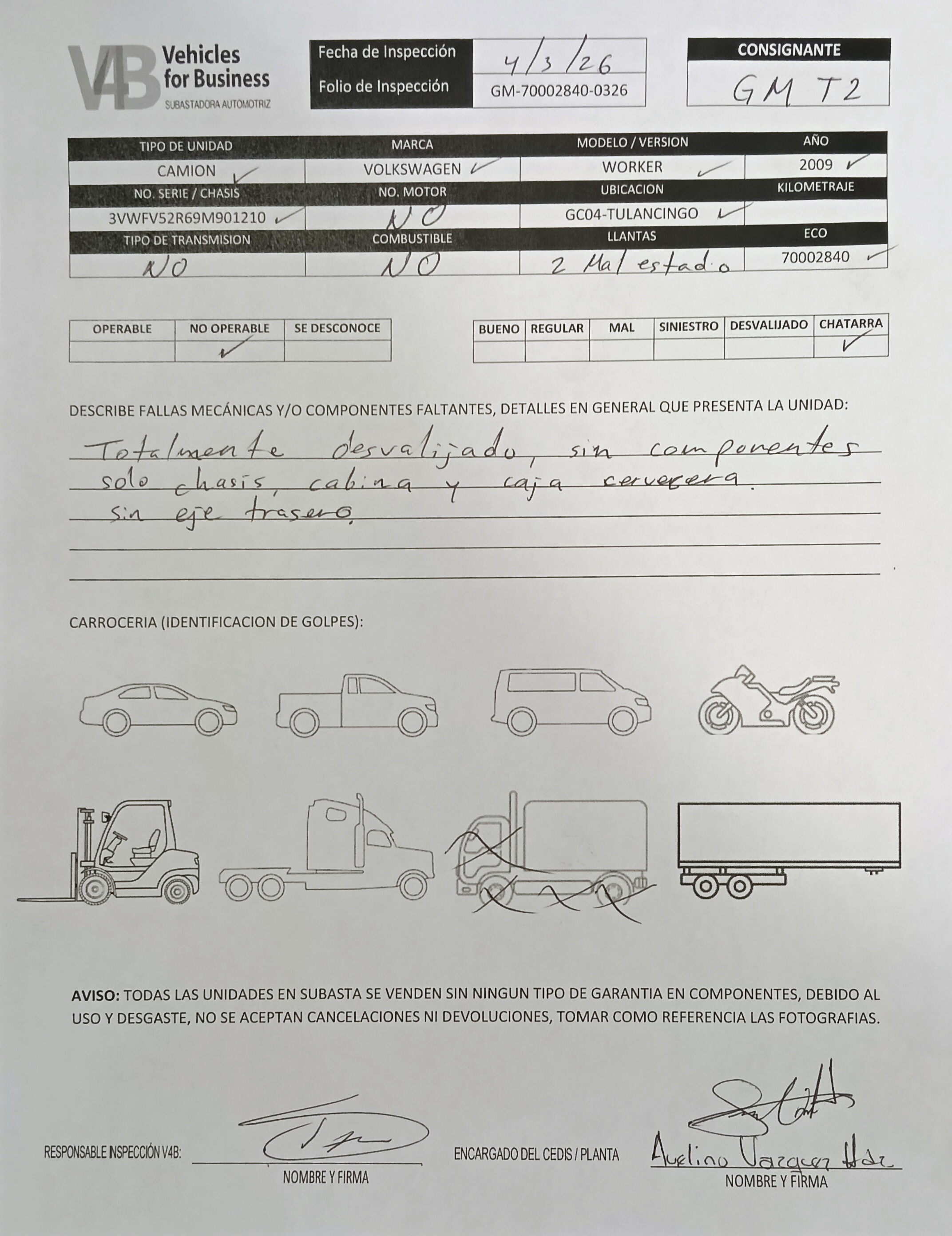 Unidad desvalijada, no cuenta con componentes principales mecanicos y electricos, sólo chasis, cabina y caja cervecera. Se requiere grua para su retiro. Se vende en el estado físico, mecánico y documental en el que se encuentra, sin ningún tipo de garantía, no se aceptan devoluciones, revisar checklist de unidad, checklist de documentos y repuve. CUENTA CON REPORTE DE RECUPERADO DE ROBO Y NO SE TIENE LA LIBERACION. SE FACTURA COMO CHATARRA, HISTORIAL DE FACTURAS COMPLETO, EL COMPRADOR ES RESPONSABLE DE REALIZAR EL TRAMITE DE BAJA DE PLACAS, ASI COMO PAGO DE ADEUDOS, RECARGOS E INFRACCIONES.
