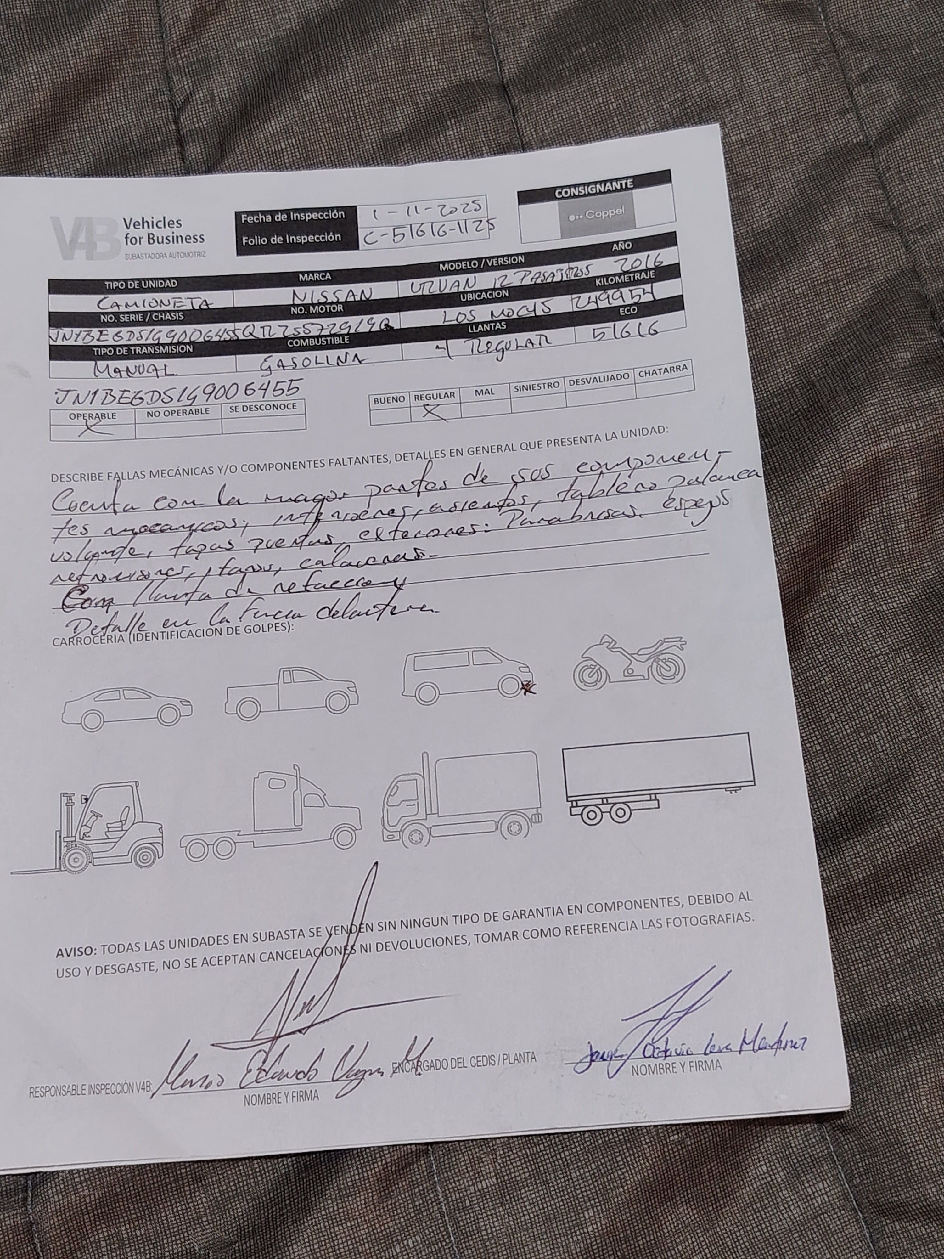 Unidad arranca pasando corriente a las baterias, cuenta con llave, detalle en la facia delantera, no se aceptan aclaraciones ni devoluciones, no se garantiza el correcto funcionamiento de componentes debido a su uso y desgaste, se desconocen daños o fallas mayores internas en componentes, documentación a entregar; copia de factura origen, factura de la empresa a comprador, copia de baja de placas, cualquier certificación de pagos o recargos corre por cuenta del comprador, consultar checklist y repuve.