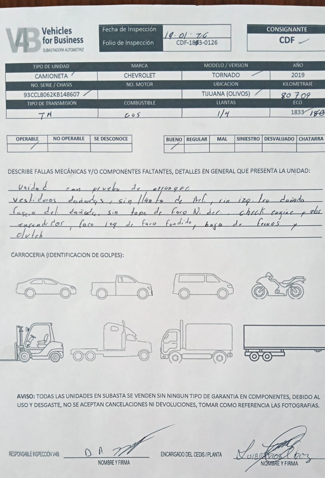 Unidad con prueba de arranque, falla en transmision posiblemente modulo, vestiduras dañadas, fascia delantera dañada, sin molduras de faros de niebla, check engine y abd encendidos, llantas con 1/4 de vida, con llave. Se requiere grua, no se aceptan aclaraciones ni devoluciones, no se garantiza el correcto funcionamiento de componentes debido a su uso y desgaste, se desconocen daños o fallas mayores internas en componentes, documentación a entregar; copia de factura origen, factura de la empresa a comprador, copia de tenencias, copia de baja de placas, cualquier certificación de pagos o recargos corre por cuenta del comprador, consultar checklist y repuve.