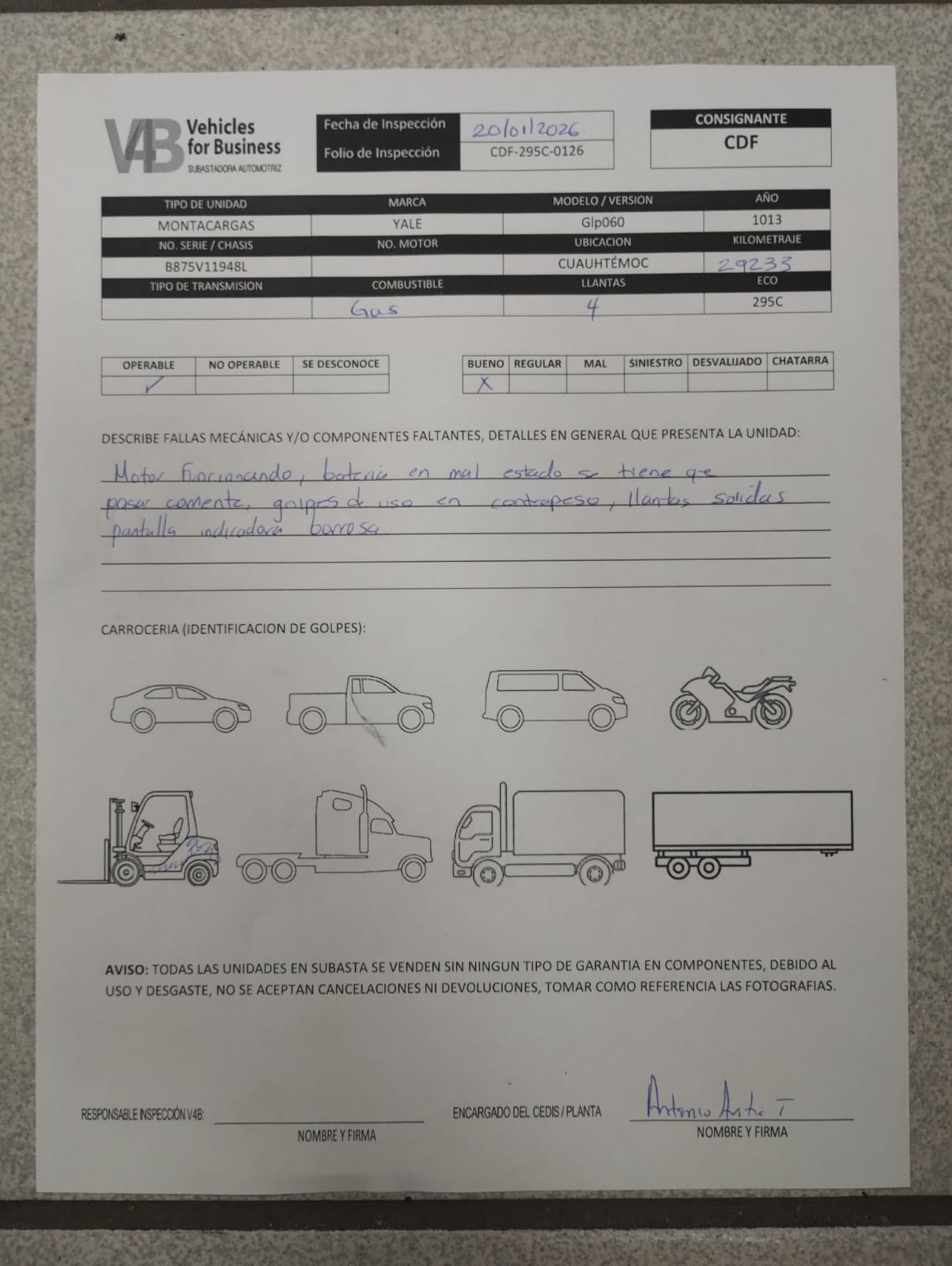 Unidad con prueba de arranque, bateria mala, golspes de suo en contrapeso, llantas 1/4 de vida, pantalla indicadora borrosa, no se aceptan aclaraciones ni devoluciones, no se garantiza el correcto funcionamiento de componentes debido a su uso y desgaste, se desconocen daños o fallas mayores internas en componentes, documentación a entregar; copia de factura origen, factura de la empresa a comprador, consultar checklist.