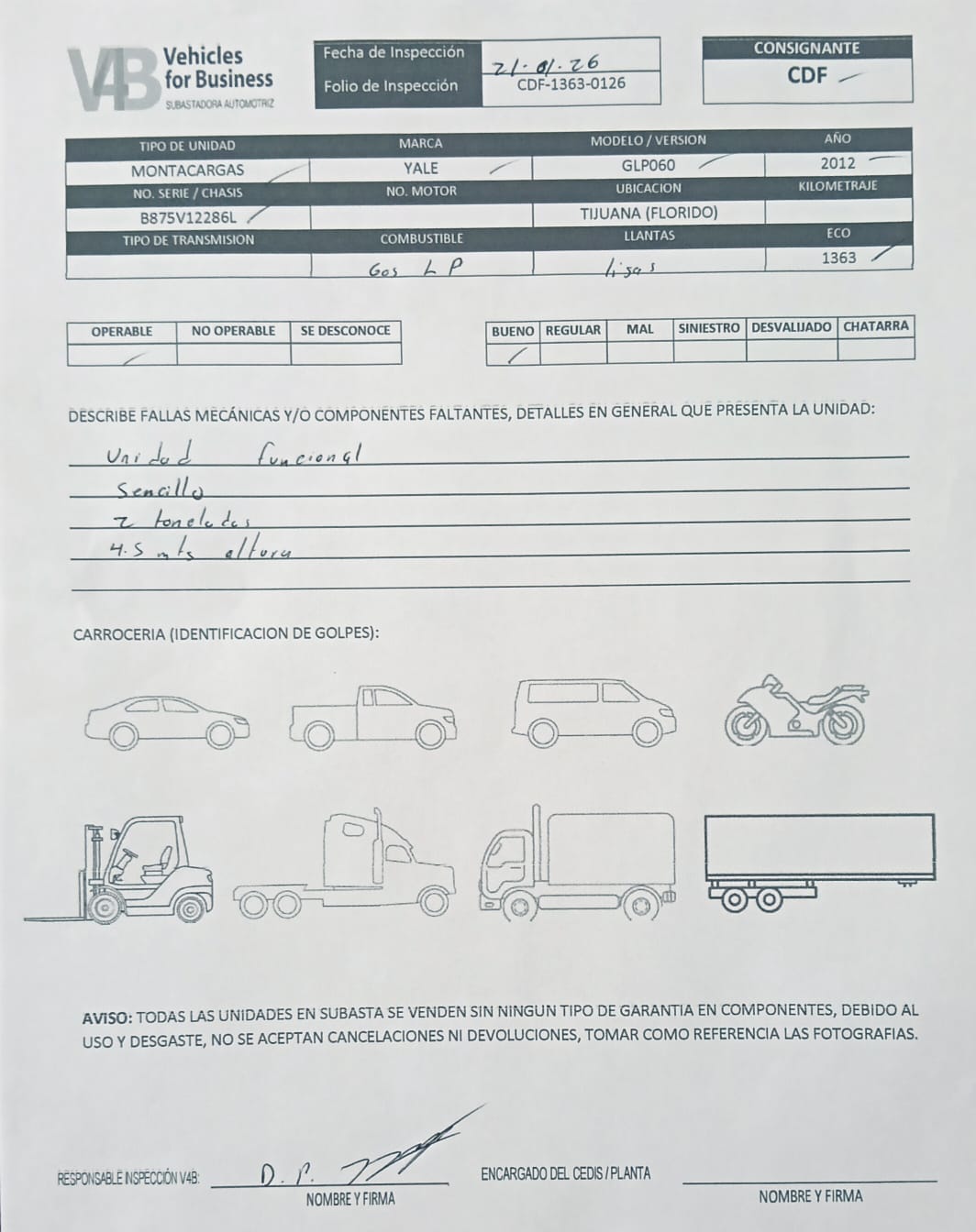 Unidad con prueba de arranque, soporta 2 toneladas, alcanza 4.5 mts de altura, portahorquillas sencillo con uñas, llantas lisas, gas LP, no se aceptan aclaraciones ni devoluciones, no se garantiza el correcto funcionamiento de componentes debido a su uso y desgaste, se desconocen daños o fallas mayores internas en componentes, documentación a entregar; copia de factura origen, factura de la empresa a comprador, consultar checklist.
