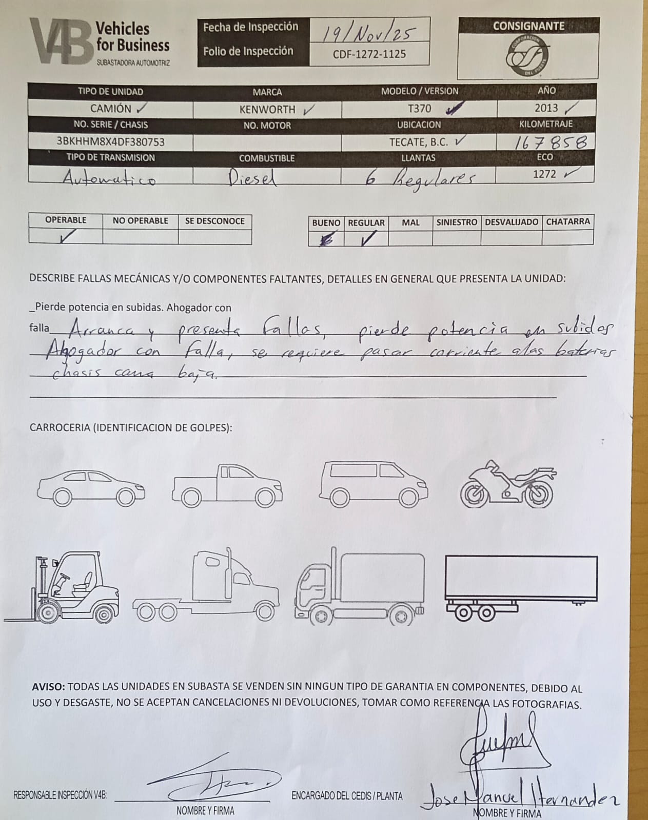 Unidad con prueba de arranque pasando corriente con fallas, pierde potencia en subidas, ahogador con fallas, chasis cama baja, golpes y rayones en carroceria en general por uso, no se aceptan aclaraciones ni devoluciones, no se garantiza el correcto funcionamiento de componentes debido a su uso y desgaste, se desconocen daños o fallas mayores internas en componentes, documentación a entregar; copia de factura origen, factura de la empresa a comprador, copia de tenencias, copia de baja de placas, cualquier certificación de pagos o recargos corre por cuenta del comprador, consultar checklist y repuve.